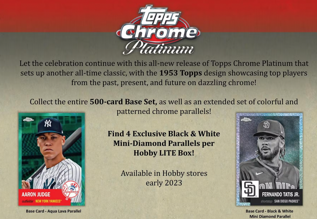 Let the celebration continue with this all-new release of Topps Chrome Platinum that sets up another all-time classic, with the 1953 Topps design showcasing top players from the past, present, and future on dazzling chrome!